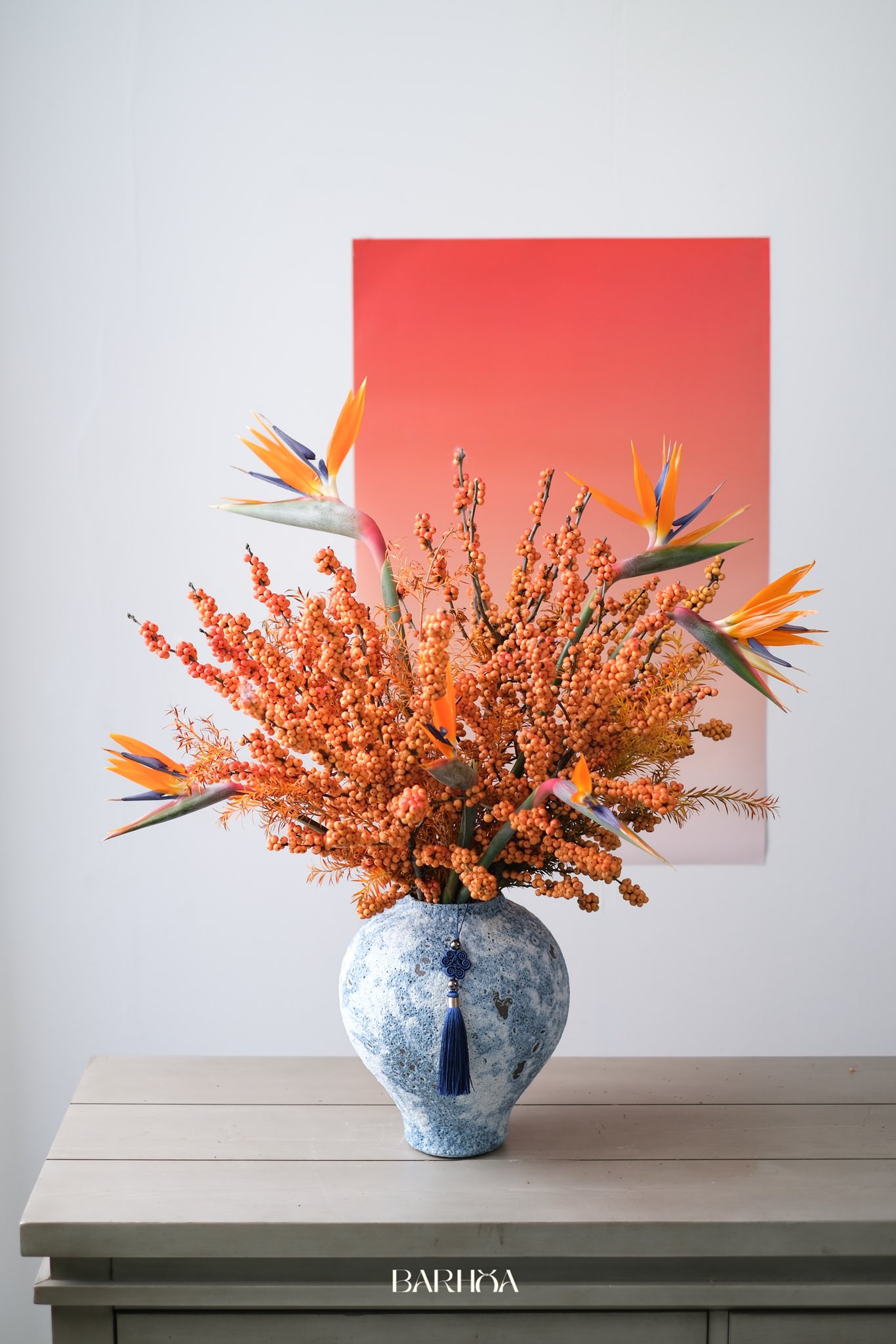 Sắc cam rực rỡ của hoa, dáng thả phóng khoáng trong bình gốm thủ công-một bản hòa sắc mang năng lượng khởi đầu, ấm áp và thịnh vượng cho không gian ngày Tết.